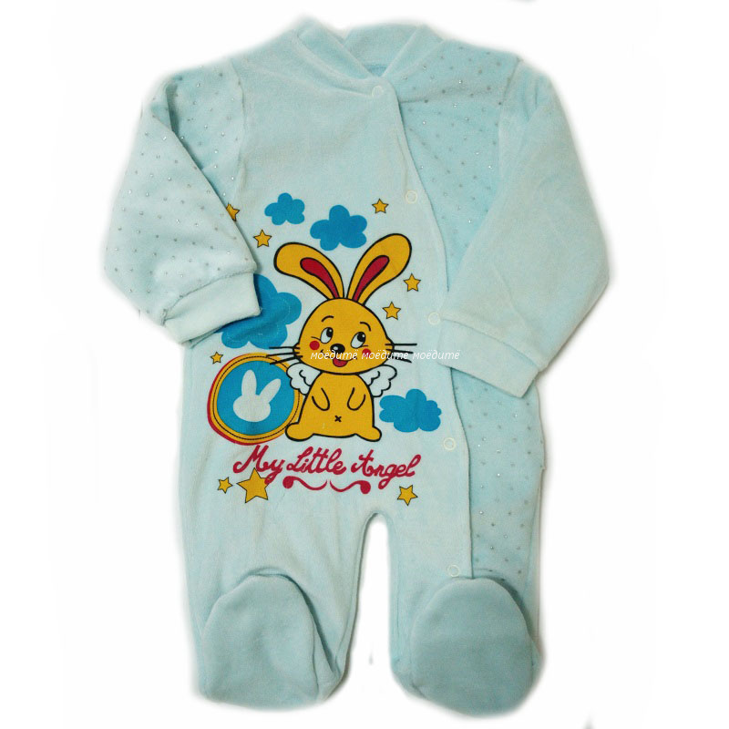 Комбинезон без капюшона, с закрытыми ножками, рукава на манжете, спереди на кнопочках от воротничка до конца ножки. Украшен спереди рисунком персонажей из мультиков.