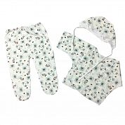 Комплект состоит из распашонки с рукавчиками трансформерами и с кнопочкой на одной стороне, ползунков на резинке, чепчика. Все швы у набора выполнены наружу. Рисунки в каждой партии отличаются.