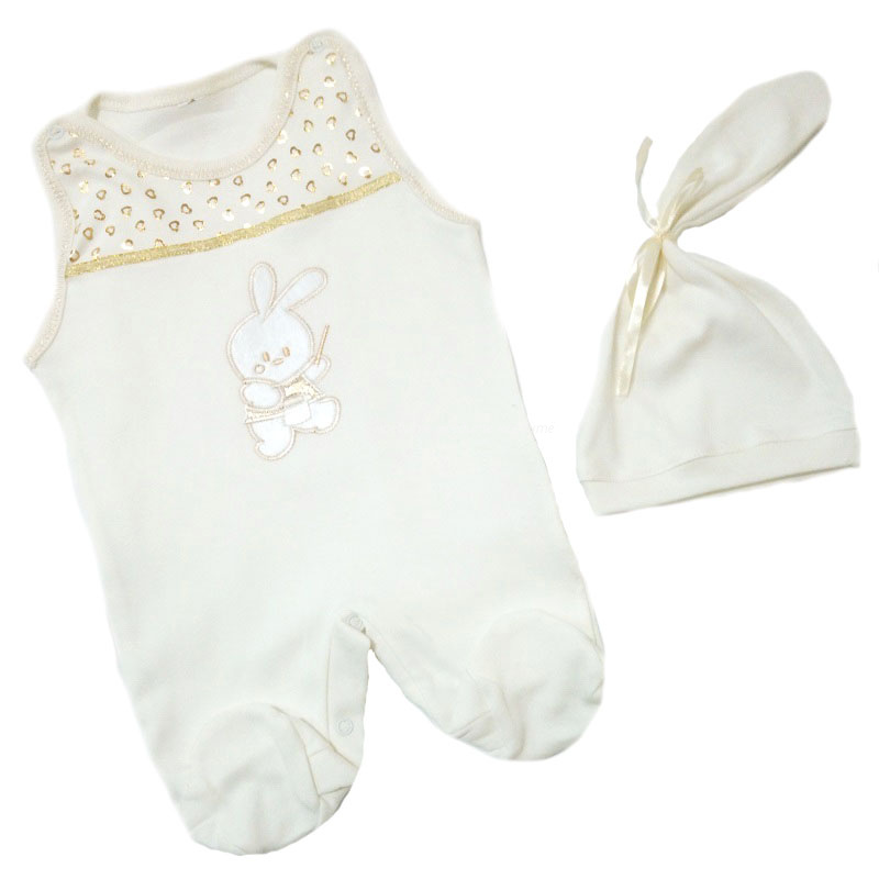 Комплект выполнен из 100% хлопка (интерлок). Комплект на девочку состоит из полукомбинезона с кнопочками на плечиках и между ножек, с закрытыми ножками, спереди украшен вышивкой и шапочки-капельки без завязок.
