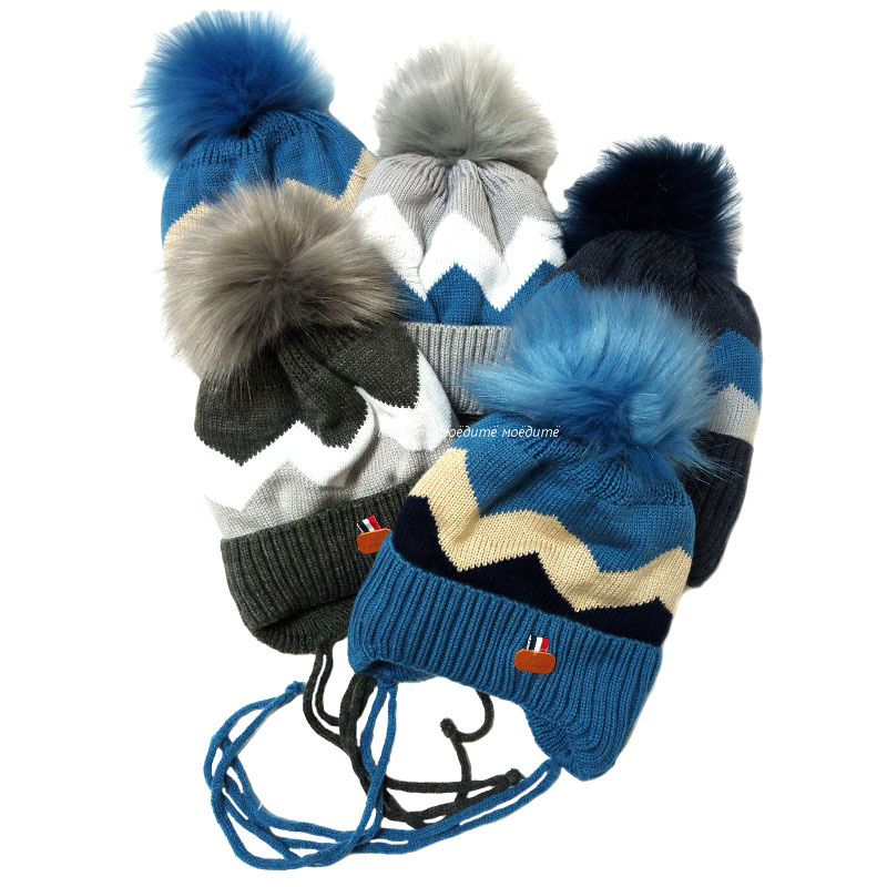В упаковке 5 штук одного размера и вида, разного цвета. Шапочка вязаная с завязками, с помпончиком из меха, на подкладке из велсофта. Очень тёплая. Размер шапочек на 4-7лет.